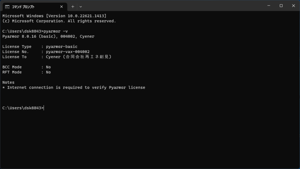 pyarmorのライセンス登録のバグに2週間、難読化処理のバグに数日間。お金を支払ってライセンスを購入したというのに散々バグ取りに付き合わされました。リリースしたてのプログラムのライセンスを購入すると痛い目にあいますね。バージョンの8.0.16の16はバグ修正の回数です。