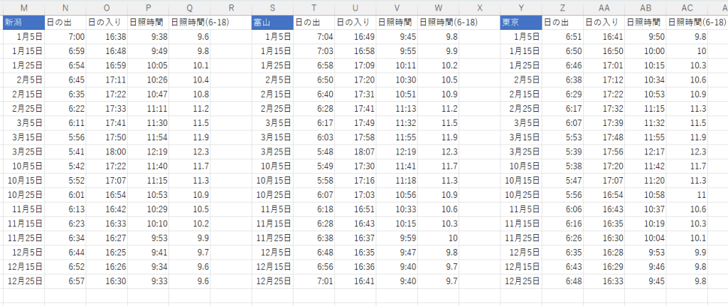 寒候期は日が短く10月頃から日照時間が12時間未満になります。そうするとアメダスの日照時間から晴れ空INDEXを計算する式=日照時間/12*60+40の分母の12を日々変化させなくてはなりません。ひとまず、1月~3月と10月~12月の日照時間を旬ごとに調べました。10月以降は旬ごとに変化させて計算する予定です。