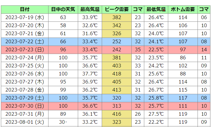 お客様のピーク需要、ボトム需要を表示するAPIに晴れ空INDEXの観測値を追加しました。追加した晴れ空INDEXの列の名前は日中の天気としています。この晴れ空INDEXが需要予測の判断材料になると良いのですが。翌日の晴れ空INDEXは今のところ計算していませんが、お客様の要望があれば計算するつもりです。