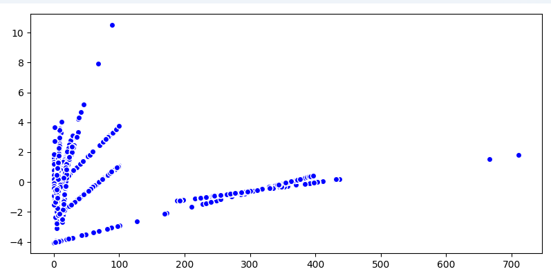 scikit-learnの使い方を勉強中です。かつてサポートベクターマシンを予測システムに実装しようと考えたことがあったのですが、結局カルマンフィルタを使っています。当時、理解も実装も困難に思えたサポートベクターマシンがscikit-learnでは簡単に使えるなんて驚きです。この図は、横軸に標準化前のデータ、縦軸に標準化後のデータをプロットしました。標準化後のデータは大きさが-4から11の範囲に収まっています。標準化後の符号の反転は問題ないのでしょうか?0から400の範囲に幅広く分布していた特徴量は符号がマイナスになっていますね。