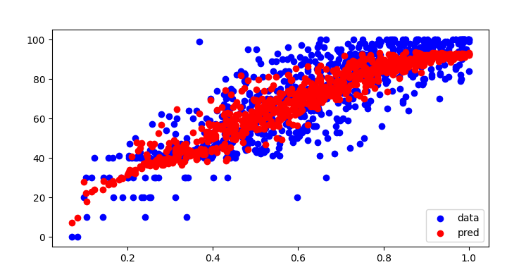 この図は晴れ空INDEXの正解によって学習した結果を散布図にしたものです。横軸は代表的な説明変数、縦軸は晴れ空INDEXです。正解の分布が青、学習後の推定値が赤です。学習によって縦の広がりが抑えられ分布が特定の線上に集中しています。説明変数の誤り(予測値の大外し)をうまく見逃して適切な分布を描いているようです。ただし、SVRを用いると晴れ空INDEXが90を超える予測をすることが難しそうです。