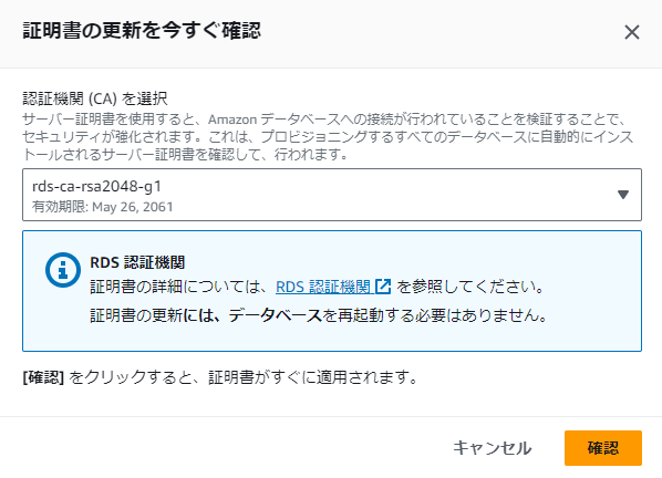 「RDSに接続するためのSSL/TLS証明書の更新が必要です。」という通知がAWSから届きました。AWSの説明文はぐだぐだと長くて分かりにくいですが、更新のためのコンソールの操作は何でもなく簡単なものでした。図はコンソールの操作画面です。必要な手順を簡潔に書くだけで十分なのに、不必要なまでに長く分かりにくい説明文章がAWS導入の敷居を高くしていると思います。