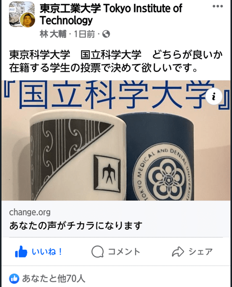 先日の閣議決定でなんと東京科学大学の仮称がとれてしまいました。まさに不意打ちです。大学側の卑怯なやり方に腹が立ったので、Facebookの東工大の公開グループに投稿したところ70件のいいね!と11件のコメントをいただきました。東京科学大学という名称に不満を持つ同士をさらに募っていきたいです。300件くらいいいね!が付いたら学長に共有しようと思います。