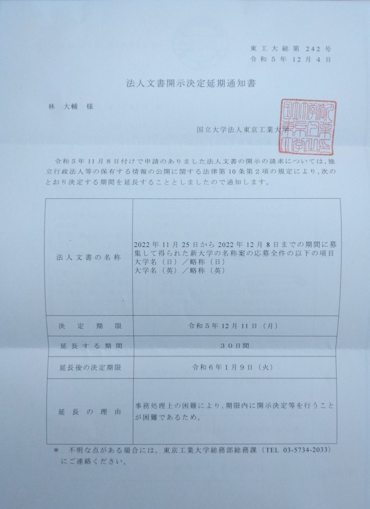 大学からの情報公開請求への回答があまりにも遅いため、総務課に問い合わせをしました。総務課によると開示判断をひと月遅らせる決定がされたそうです。理由は資料の特定に時間がかかっているからだそうです。4週間も待たせて何をしていたんでしょうか?私がお手伝いしますと言っても聞き入れてもらえませんでした。SQLを実行すれば良いだけなのに。すぐに公開したくないという意図が見え見えですね。情報開示の最終的な決定は学長の判断に委ねられるそうです。公開すると法案審議に影響があるのでしょうか?