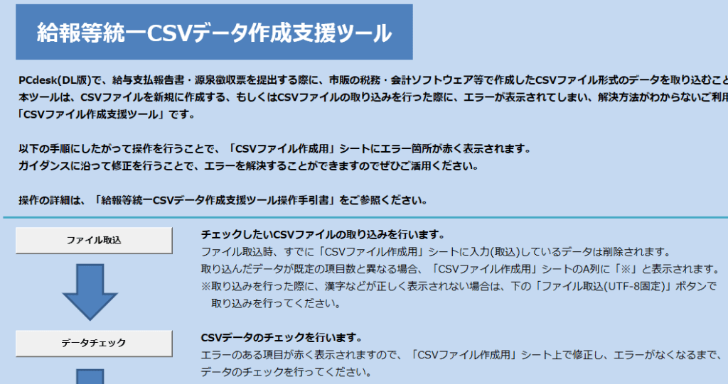 このツールを使ってPCdesk(DL版)に読み込ませるデータファイルを作ります。144項目設定する欄があります。その中で注意点。16の種別=給料、19,20,21は年末調整計算シートの⑨,⑳,㉕の金額。23の配偶者無し=2。36は社会保険料の支払合計。37は小規模企業共済の支払額。92には国民年金、国民年金基金の支払額。134の普通徴収=0。