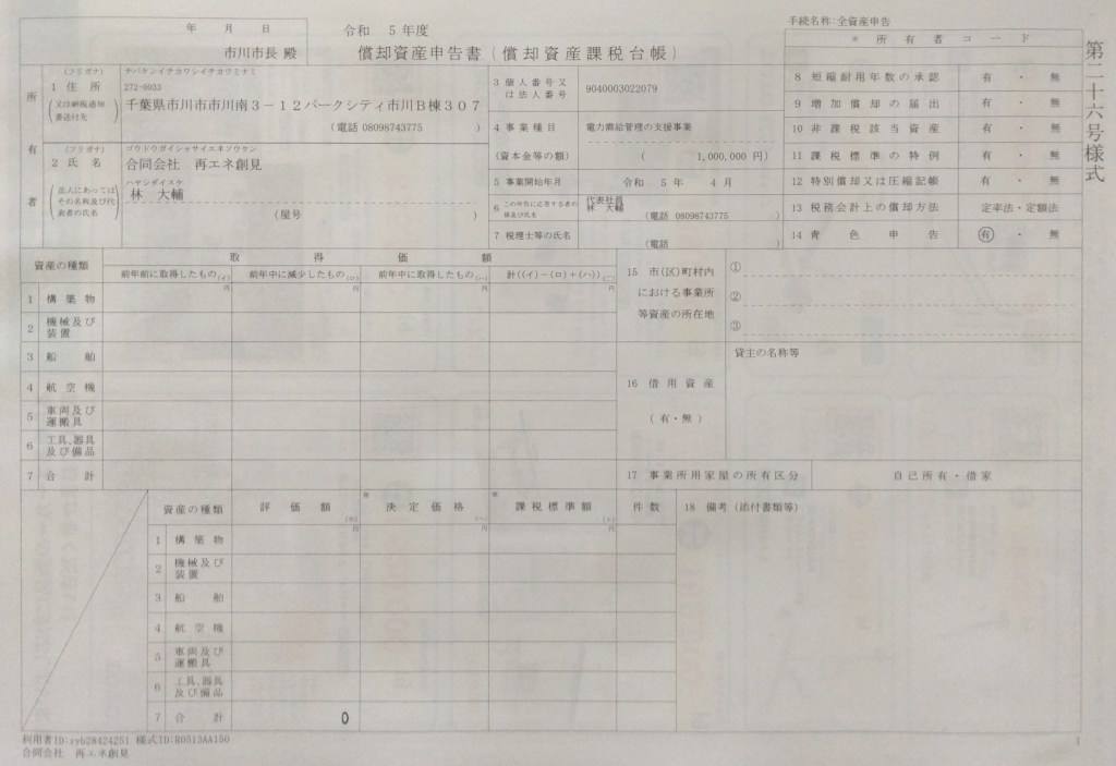 eLTAXから償却資産の申告をしました。合同会社再エネ創見の償却資産はゼロです。AWSのRDSのリザーブドインスタンスは3年以下で償却するので対象外です。使っているパソコンは事業を立ち上げるために購入したものではなく、昔からの私の持ち物ですし、そもそも10万未満だったと思います。事務所のエアコンは個人事業の再エネ創見の償却資産であり手書きの申告書を市役所に郵送しました。