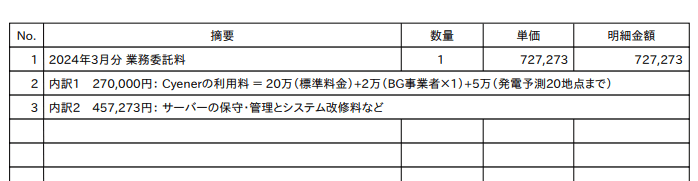 有難いことに22日金曜日に取引先から業務委託料の増額の打診がありました。業務委託契約を開始した当初はCyenerの導入は想定していなかったため、その費用を支払いたいとのことでした。ですが即座にお断りしました。こちらとしてはCyenerの利用料は業務委託料に含まれるという認識です。私は会社から独立するときに必ず恩返しをすると伝えていました。その恩返しがCyenerの導入なのです。これで業務委託料を増額してもらっては恩返しになりません。それにこれ以上、前の勤務先に依存したくないという思いがあります。先方からはどうしても支払いたいと言われたので、増額の替わりに毎月の作業量を0.5人月から0.3人月にしてほしいと伝え打診をなんとか退けました。次回の請求書には上記のように内訳を記載します。