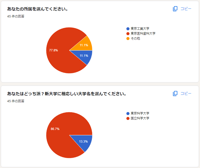 皆様の呼びかけの甲斐あって6月23日20時の時点で45票の貴重なご意見をいただくことが出来ました。誠にありがとうございます。現状では国立科学大の支持(86.7%)が東京科学大の支持(13.3%)を圧倒しています。医科歯科大の投票が大多数(77.8%)を占める理由は、ポスターの掲示日に違いがあるためです。医科歯科大の近くの掲示板には20日16時頃、東工大の近くの掲示板には22日8時頃にポスターを貼りました。学生数は東工大が約10000人、医科歯科大が約3000人ですので、次第に東工大の割合が増えると思います。来週もこのブログにて投票状況を報告いたします。引き続き投票の呼びかけをどうかよろしくお願い致します。