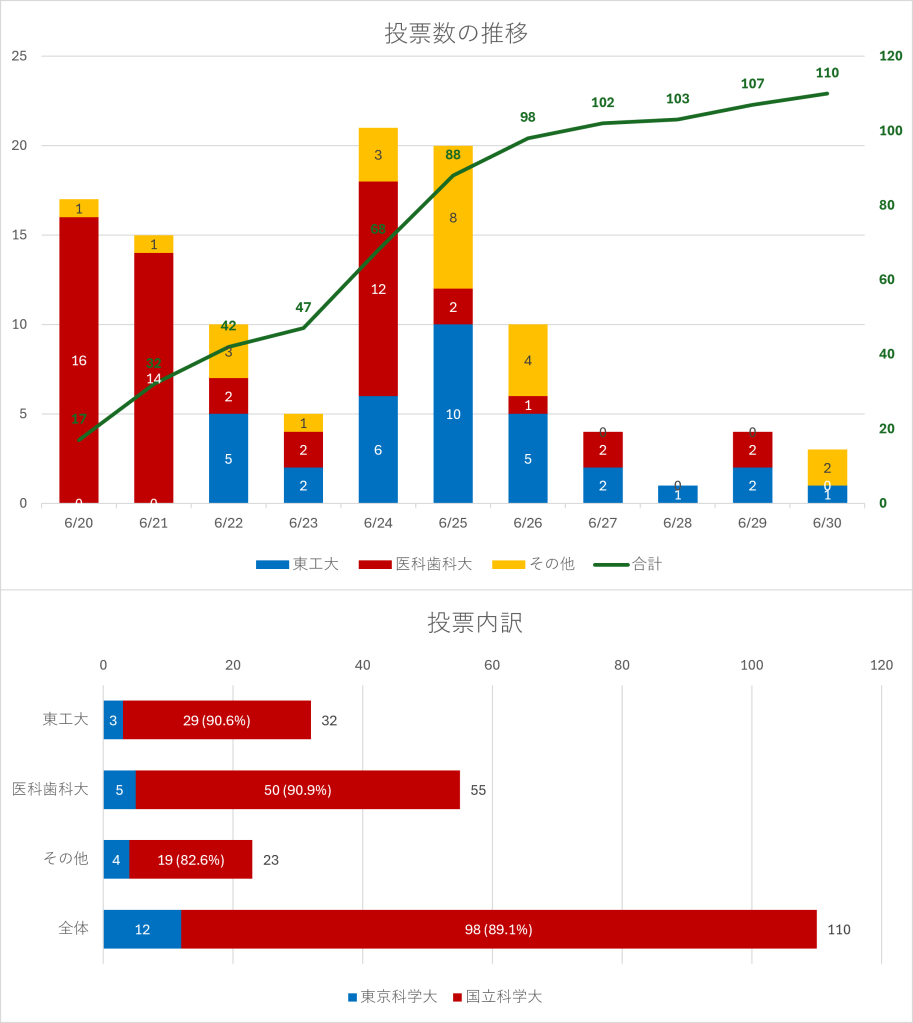6月25日までは票数の伸びに勢いがあったのですが、それから落ち着きました。ですが少しずつ票が積み上がっているので、真の支持率を確かめるためには、7月7日で終わりにしないで投票期間を延ばしたほうが良いかもしれません。投票を待ちくたびれて27日に一回は終了宣言をしたのですが、気長に投票状況を見ていこうと思います。