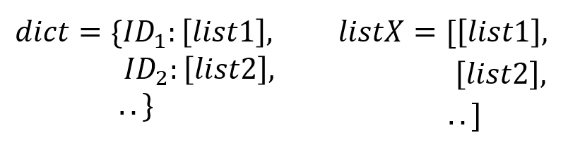 Pythonで複数のリストを処理するときに、データを2次元のリストとして扱うよりも、この左のようにリストのIDをキーとして残りの要素を値とする辞書にしておくと非常に扱いやすいです。辞書とリストのいいとこどりをしたデータ形式だと思いますので是非ともおすすめします。