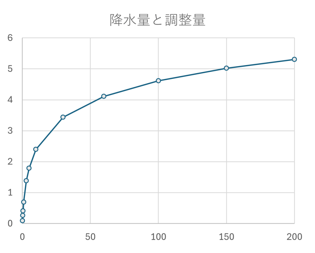 前回のロジックの修正によって晴れ空INDEXの適中精度が高くなりましたが、雨や曇りのときに大きめに計算される傾向がありました。これを修正するために降水量の予測値を用いることにしました。降水量の予測値は1時間単位ではほとんど当たりませんが、12時間や24時間といった積算値であれば、降水量予測の指標として用いることが出来ます。今回は12時間の降水量の予測値の対数をとって、これを基準にして晴れ空INDEXを調整するようにしました。今回の修正によって台風や梅雨前線による大雨の時に晴れ空INDEXが不自然に大きくなることはなくなります。