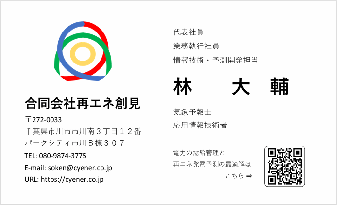 新しく名刺を作りました。文字や画像の配置はおおむね前回の名刺に倣っていますが、会社名と氏名を太字にして「電力の需給管理と再エネ発電予測の最適解はこちら⇒」という文字を入れてQRコードの位置を右隅に変更しました。東京カラー印刷に発注しました。果たして出来栄えはいかに。