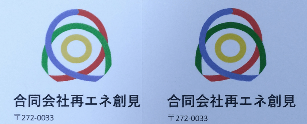 印刷会社にPDFの原稿を渡すときには、色の指定をCMYKにすることをお勧めします。色の指定をRGBにしていると印刷機の違い(トナーの違い)によって写真の2つのロゴマークような色の違いが起こることがあります。RGBが光の三原色のRレッド、Gグリーン、Bブルーに対して、CMYKとはインキの三原色のCシアン、Mマゼンダ、Yイエロー、Kキープレート(黒)のことです。恐らく印刷会社の装置は、家庭用のプリンターと違って、インキの三原色による色の指定(CMYK指定)を原則としているのではないかと思われます。このため、原稿の色がRGBで指定されていると、通常では想定していないCMYKへの変換処理が発生して、その処理がうまくいく場合とうまくいかない場合があると思われます。恐らくRGBからCMYKへの変換方法は1種類だけで、運良くその方法に適合する印刷機に当たれば、正しい色で印刷されるのだと思います。それぞれの印刷機に合わせてRGB⇒CMYKの変換をすれば、このような色の違いは起こらないと思いますが。