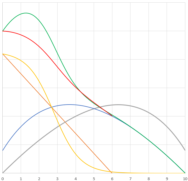 私の研究によると太陽光の一部が雲に遮られて、減衰しながら地上に届くとき、もともとの太陽光の強さの4割程度までに弱まっていると直達日射はほぼなくなり、ほとんどが散乱日射になるようです。晴れ空INDEXはこの性質を利用して作っています。この図は雲量(横軸)と日射量(縦軸)との関係を図にしたものです。赤線が全天日射量でそのうちの散乱日射量が青線で、赤線-青線=直達日射量です。雲量が増えると全天日射量は減り、全天日射量に占める散乱日射量の割合が増えています。