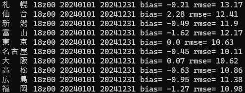 上図は2023年6月~2023年12月の7か月を学習期間として、2024年の1年間の晴れ空INDEXを計算して精度評価したものです。札幌、仙台、新潟、富山は予測が難しくRMSEが12~13ですが、その他はおおむねRMSEが10~11くらいです。札幌や富山はこれまでの固定の予測式による予測に比べ予測精度が大きく改善されると思います。