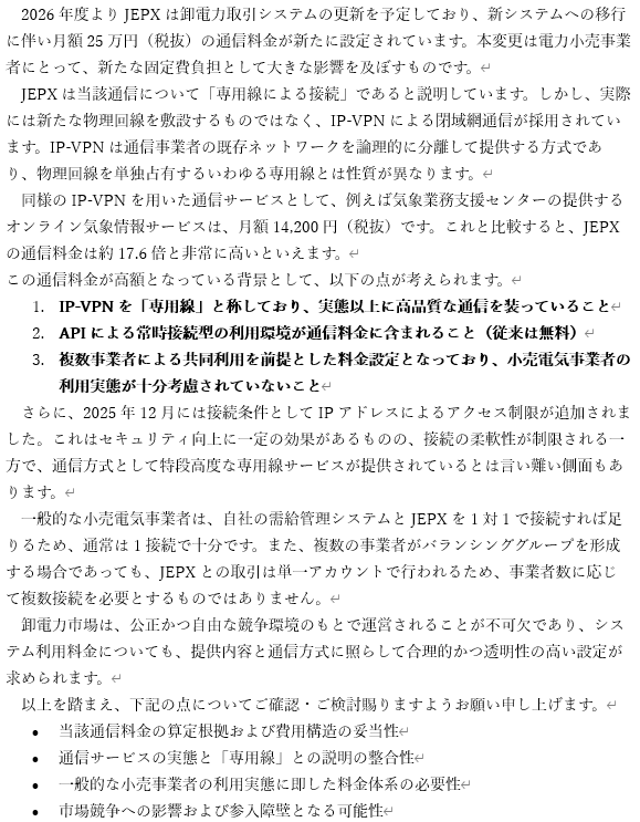 日本卸電力取引所JEPXの電力取引システムのAPIは現在無料で使うことが出来ますが、2026年度から新システムが稼働してAPIの利用料(通信費)が発生します。この利用料(通信費)が毎月27万5000円(年間330万円)ということで異常に高いのです。現システムはインターネット回線を使ってAPIを利用できますが、新システムでは専用線を使って通信するため高額なのです。