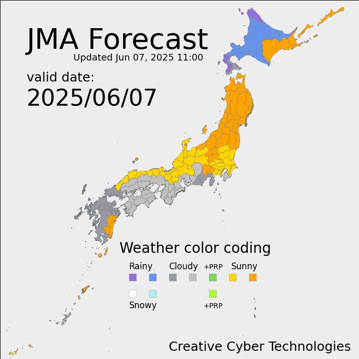 気象庁の天気予報を10種類に分類して色を割り当てました。そして、一次細分の地図を気象庁の天気予報によって色分けしました。凡例のマーカーは右ほど晴れ寄り、左ほど雨寄りの天気です。緑のマーカーは晴れ一時雨や晴れ一時雪などです。色が切り替わる地域は”のち”の付いた予報です。”then…”の画像が後続の天気です。