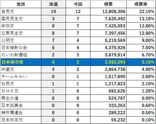 参議院選挙の比例代表の枠で日本保守党は2議席を獲得しました。北村弁護士と百田代表が当選者です。私は有本さんに投票したのでもう一議席ほしかったですね。この結果によって日本保守党は政党要件をすべて満たし完全な国政政党になりました。これでNHKの党首討論に毎回呼ばれますので、有本さんも幹事長として出演して無双してほしいです。